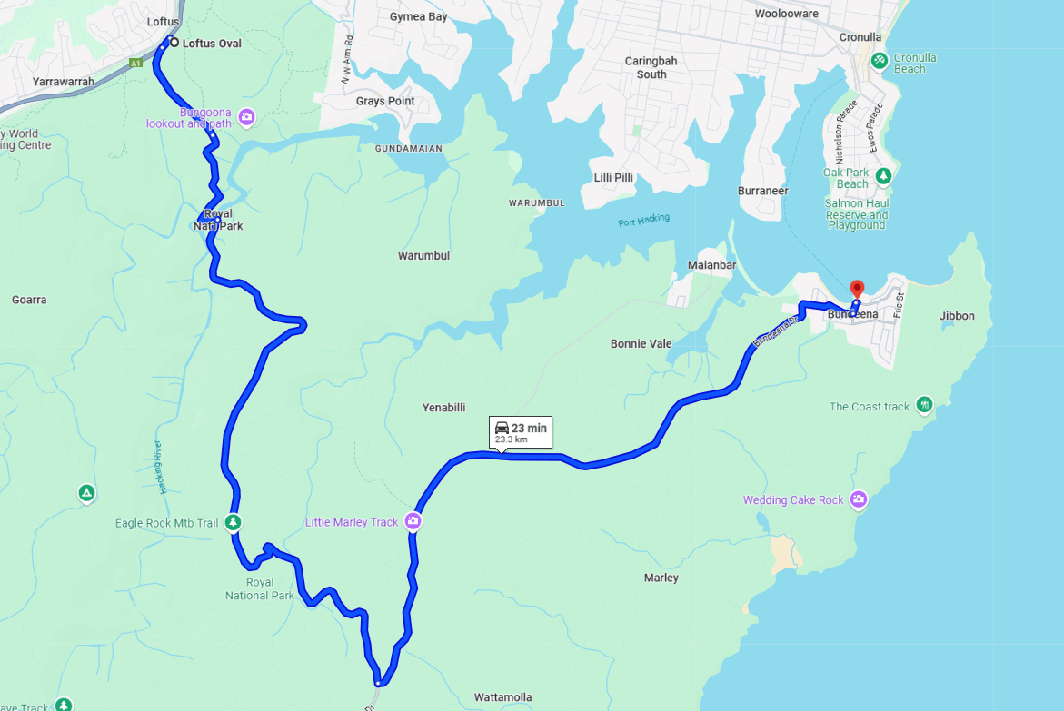 - Leave by Bundeena Dr, retuen to Sir Betram Stevens Drive – 10km