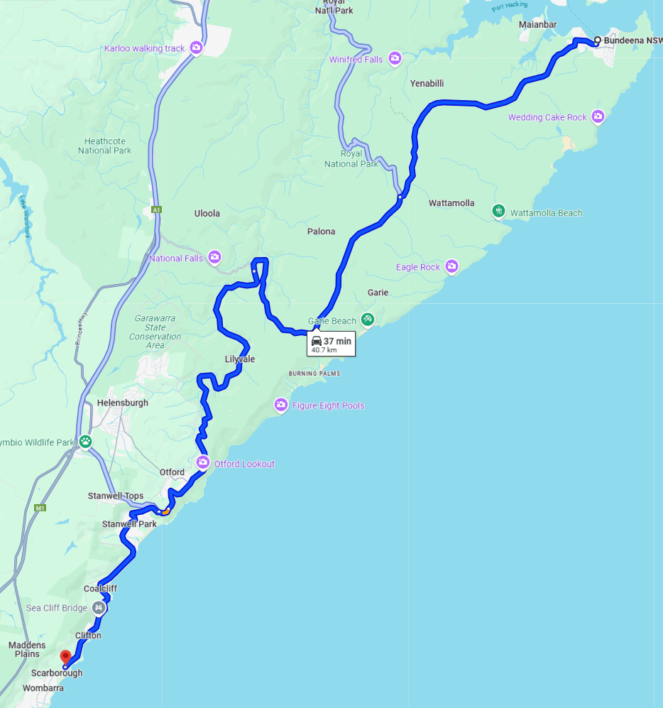 - Turn left onto Bundeena Dr – 10kms