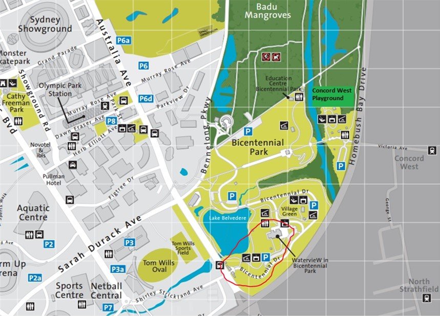 Place: Waterview Café, Bicentenial Park, Bicentenial Drive, Homebush. Enter from Australia Avenue. See map below.
